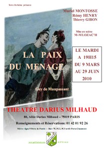 14, 15, 28 et 29 mars 2008 : Représentations de La Paix du ménage par la compagnie Théâtre d'Ailleurs au théâtre Château Landon (Paris 10e). m.e.s. Jean-Pierre Cormarie.